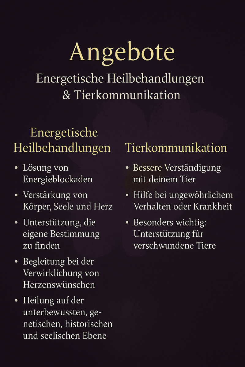 Ausgebildet in ThetaHealing und Tierkommunikation, habe ich im Laufe der Zeit meine eigene energetische Heiltechnik entwickelt – inspiriert durch den Schöpfer